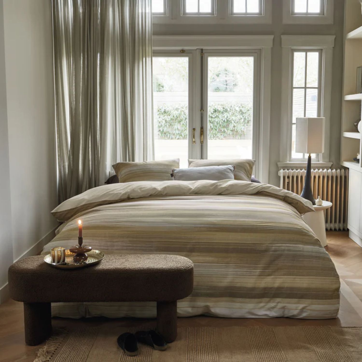 Ben jij een liefhebber van unieke prints die direct een eyecatcher vormen in de slaapkamer? Het Beddinghouse Elie dekbedovertrek is dan de perfecte keuze. Het ontwerp bestaat uit abstracte horizontale banen met subtiele kleurverlopen, gecombineerd met gouden accenten en warme aardetinten. Het resultaat is een sfeervol en luxe geheel dat je slaapkamer een chique uitstraling geeft. De achterzijde is effen van kleur, waardoor je eenvoudig een verzorgde omslag creëert en de look compleet maakt.