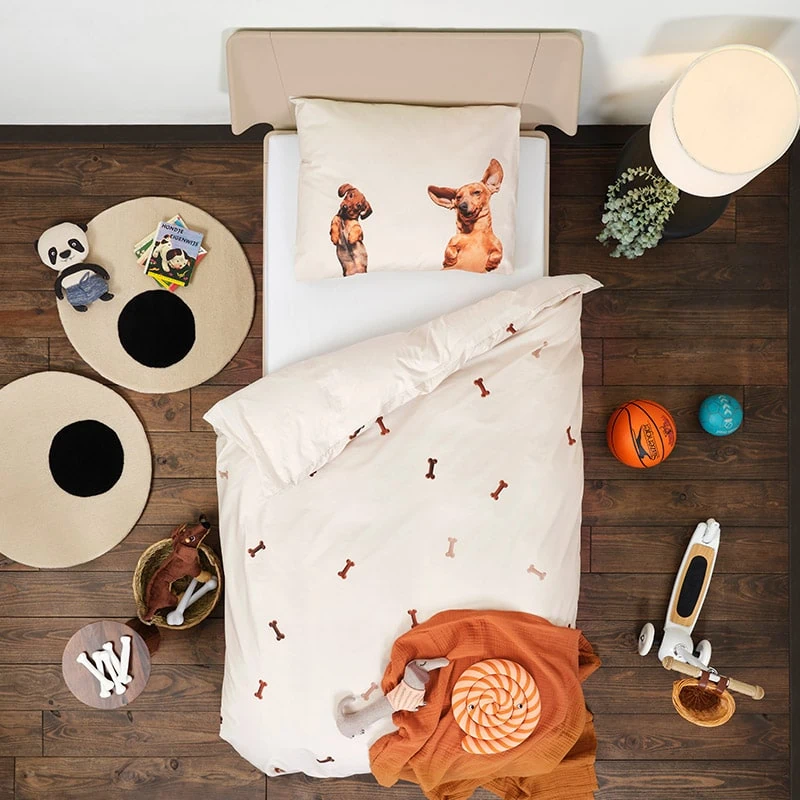 Val met een glimlach in slaap tussen deze twee Teckel hondjes die je dromen delen en bewaken. Met de kluifjes print op het beige overtrek wordt je slaapkamer een knus hondenparadijs. Deze dekbedovertrek-set is onderdeel van een serie: ook verkrijgbaar met Beagles of Corgi’s. Bovendien zijn de kussenslopen los bij te bestellen!