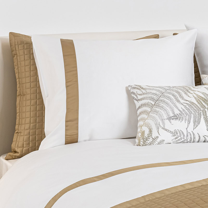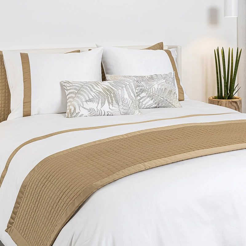 Het Listra Wit/ Brons dekbedovertrek, gemaakt van katoen satijn, straalt elegantie uit. Wat het bijzonder maakt, is de horizontale bronskleurige band die over het dekbedovertrek loopt, terwijl de bijpassende kussenslopen een verticale bronskleurige band hebben. Het gebruikte katoen satijn, met een threadcount van 300, is een hoogwaardige stof die bekendstaat om zijn duurzaamheid en weerstand tegen pillen. Het voelt glad en zacht aan, wat het geschikt maakt voor elk seizoen.