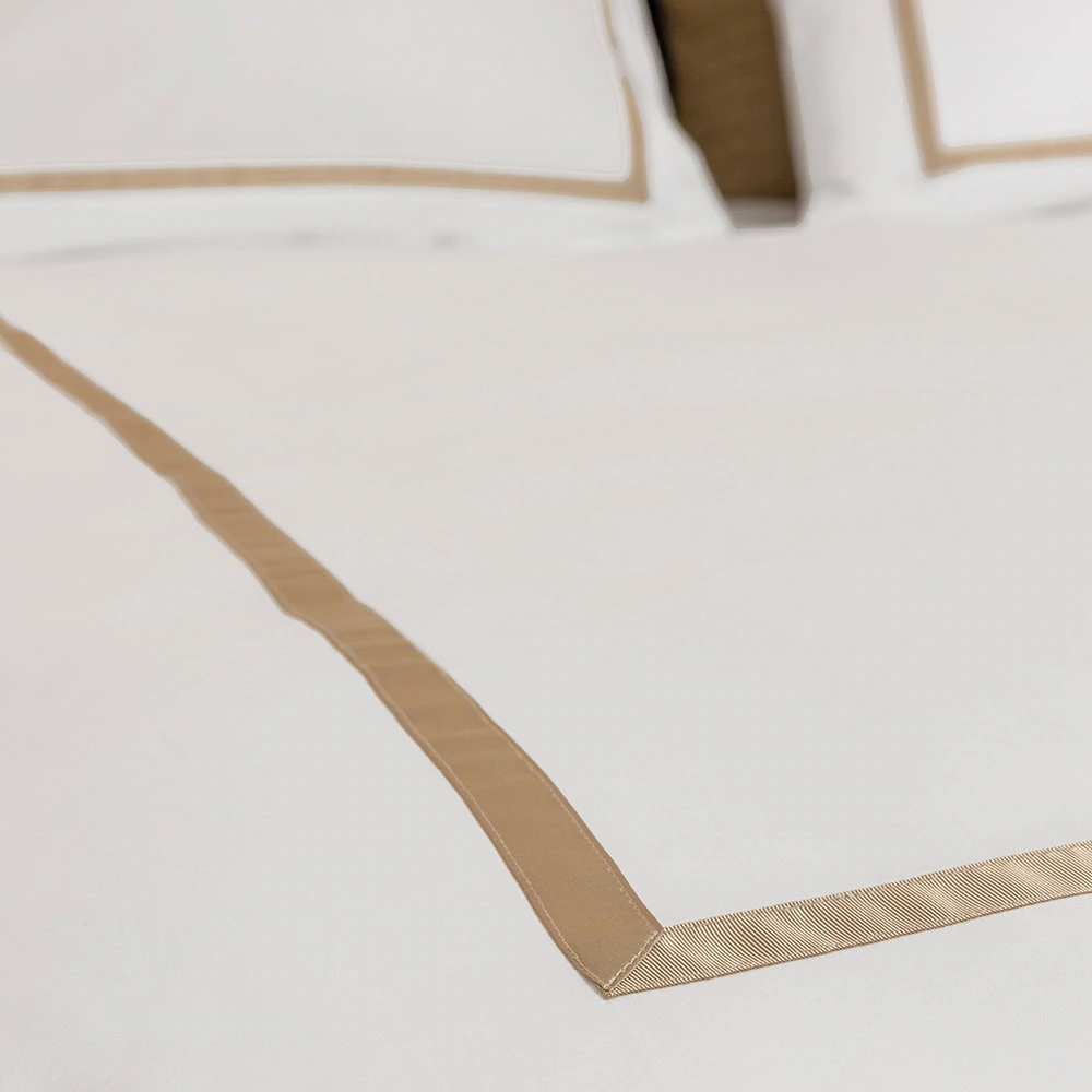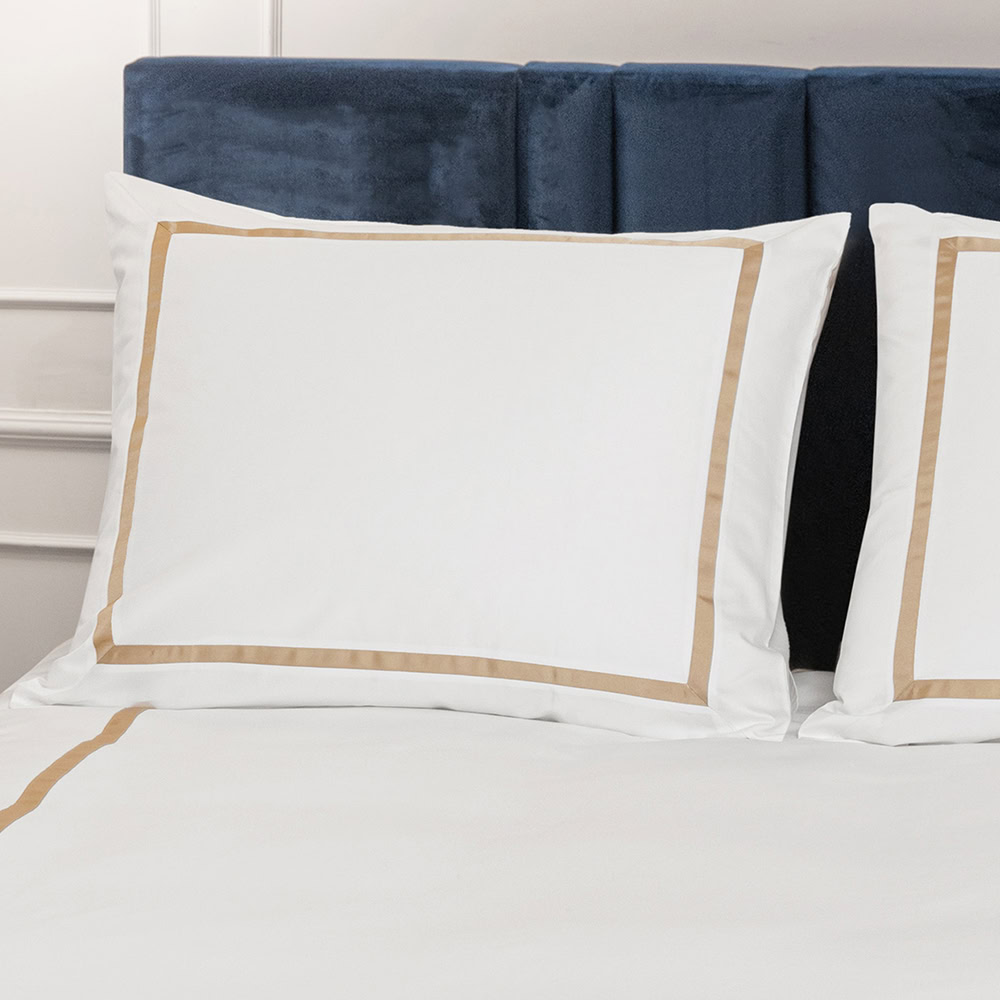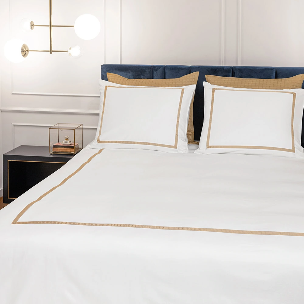 Dekbedovertrek katoen satijn is een fris hotel dekbedovertrek in de kleur wit. De contrasterende bies rondom in chique goudtint maakt het dekbedovertrek extra bijzonder. Het dekbedovertrek Mirror is gemaakt van de mooiste kwaliteit katoen satijn in 600 TC (thread count). De stof is vergelijkbaar met Egyptisch katoen satijn: Gemaakt van lange katoenvezels, zeer zacht en sterk. Het effen wit dekbedovertrek past bij alle slaapkamers. Het oogt niet alleen eenvoudig, maar ook stijlvol, sereen en rustgevend. Alsof je de sfeer van een luxe hotelkamer in huis haalt.