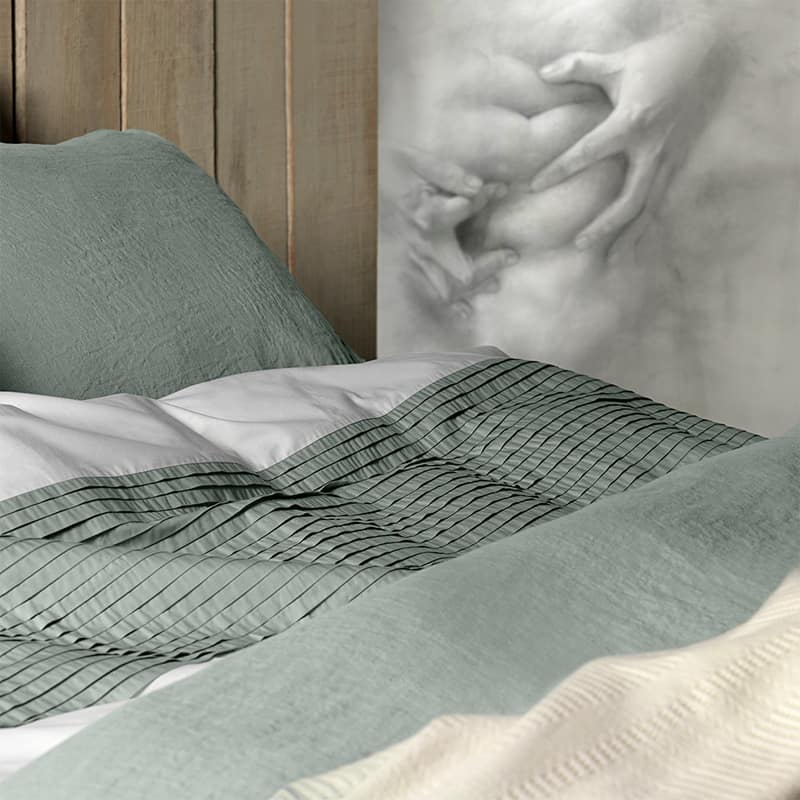 Dekbedovertrek percal katoen – Elements Groen is een elegant dekbedovertrek in de kleuren wit met spargroen. Opvallend is het gladde percal gedeelte wat overgaat in groen gekleurde vastgestikte plooien. Deze plooien lopen horizontaal over het dekbedovertrek. De gebruikte stof is een heerlijk zachte percal katoen gemaakt van 200 threadcount. De onderkant van het dekbedovertrek is helemaal glad, zo heb je met slapen geen last van de plooien. Het materiaal percal is een sterke stof wat niet snel gaat pillen, glad en zacht aanvoelt en fijn koel is in de zomer.