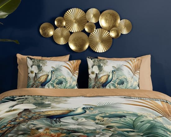 Het “Dana” dekbedovertrek van Descanso combineert een verfijnd patroon van bladeren en vogels in zachte, natuurlijke kleuren. De voorzijde trekt meteen de aandacht, terwijl de achterzijde in een bijpassende uni-kleur voor rust zorgt.