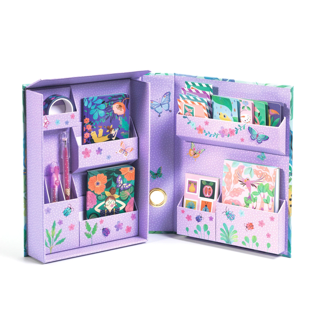 De Marie Stationery Cabinet is een ware schatkamer vol creativiteit met een tropisch tuinthema. Ontworpen als een boek dat openklapt en talloze opbergvakken onthult, bevat het een verfijnd assortiment schrijfwaren: 2 notitieboekjes, 1 notitieblok, 4 kaarten, 4 enveloppen, 1 afplaktape, 4 stickervellen en 2 gelpennen. Een must-have om je ideeën te ordenen en je creaties stijlvol te personaliseren.