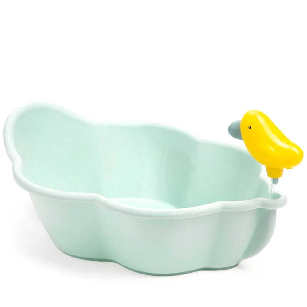 Tijd om in bad te gaan! Het badje heeft de vorm van een schelp en is voorzien van een vogeldouchekop voor een aangenaam moment in bad. De douche werkt als spuitspeelgoed. Als het water gepompt is, komt het er door de snavel van de vogel weer uit. Als de pop gewassen is, wordt het badje geleegd en gespoeld met schoon water.