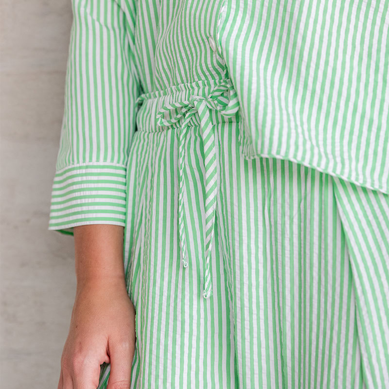 De Henriëtte pyjama is een veelzijdige toevoeging aan de geweven collectie van Alice et Maman en is perfect om zowel in te slapen als casual te dragen. Dit lichte setje is gemaakt van luchtige seersucker- stof met frisse katoenen strepen en combineert moeiteloos comfort met stijl. De ademende stof zorgt voor een ontspannen gevoel, terwijl de levendige kleur ‘Fresh Green’ een speelse en verfijnde uitstraling geven.