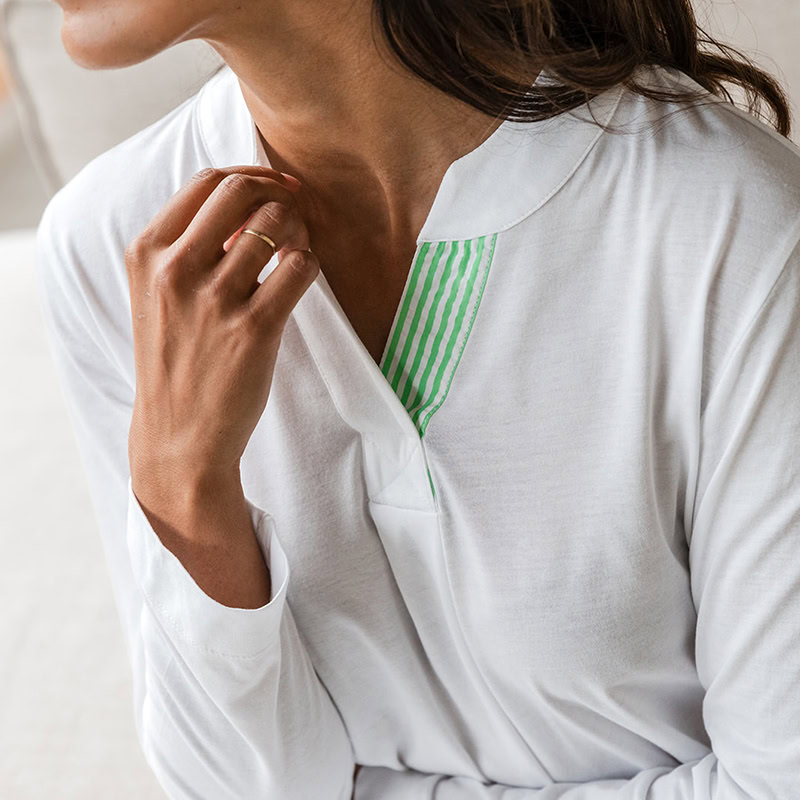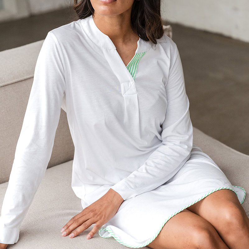 De Jacqueline Nightdress is een stijlvolle en comfortabele keuze, gemaakt van zacht en ademend katoen met een ontspannen pasvorm. Het ontwerp heeft een V-hals met subtiele plooitjes, lange mouwen en verfijnde katoenen strepen als elegante detail.