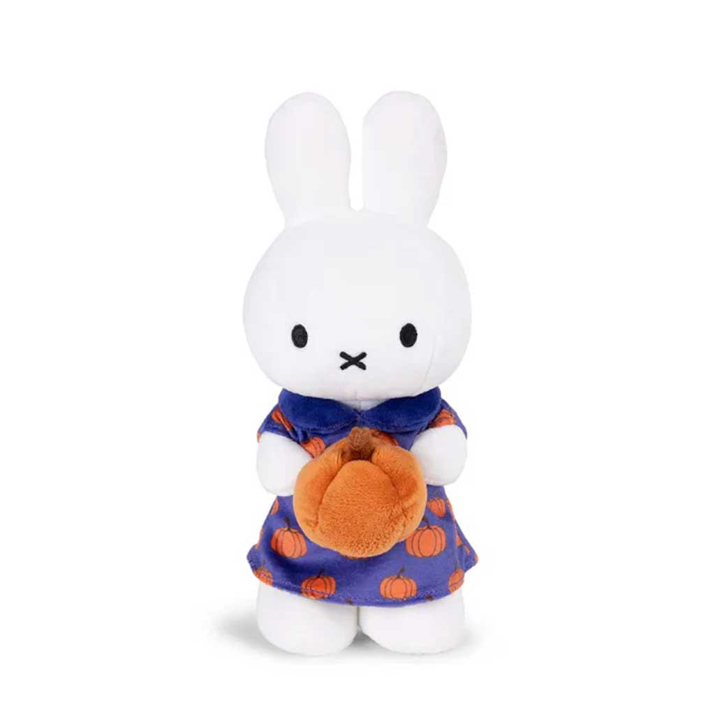 Staande Nijntje in het Engels Miffy, met in haar hand een pompoen, en een jurkje met pompoenen er op. afmeting: 24cm
