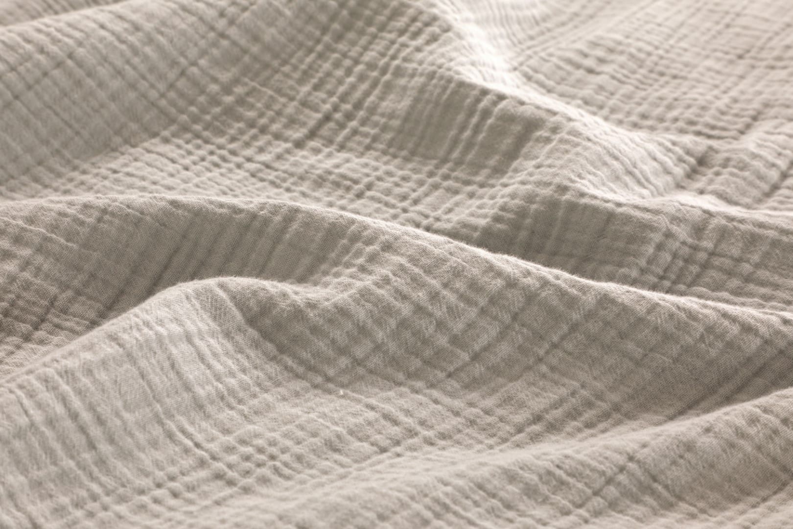 Mousseline, ook wel double gauze genoemd, is een unieke stof die bestaat uit twee fijne lagen los geweven katoen. Deze zijn op enkele punten subtiel met elkaar verbonden, waardoor een karakteristieke, natuurlijke kreukstructuur ontstaat – het bekende crinkle-effect.